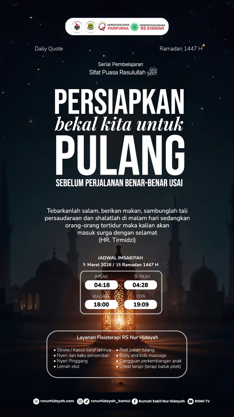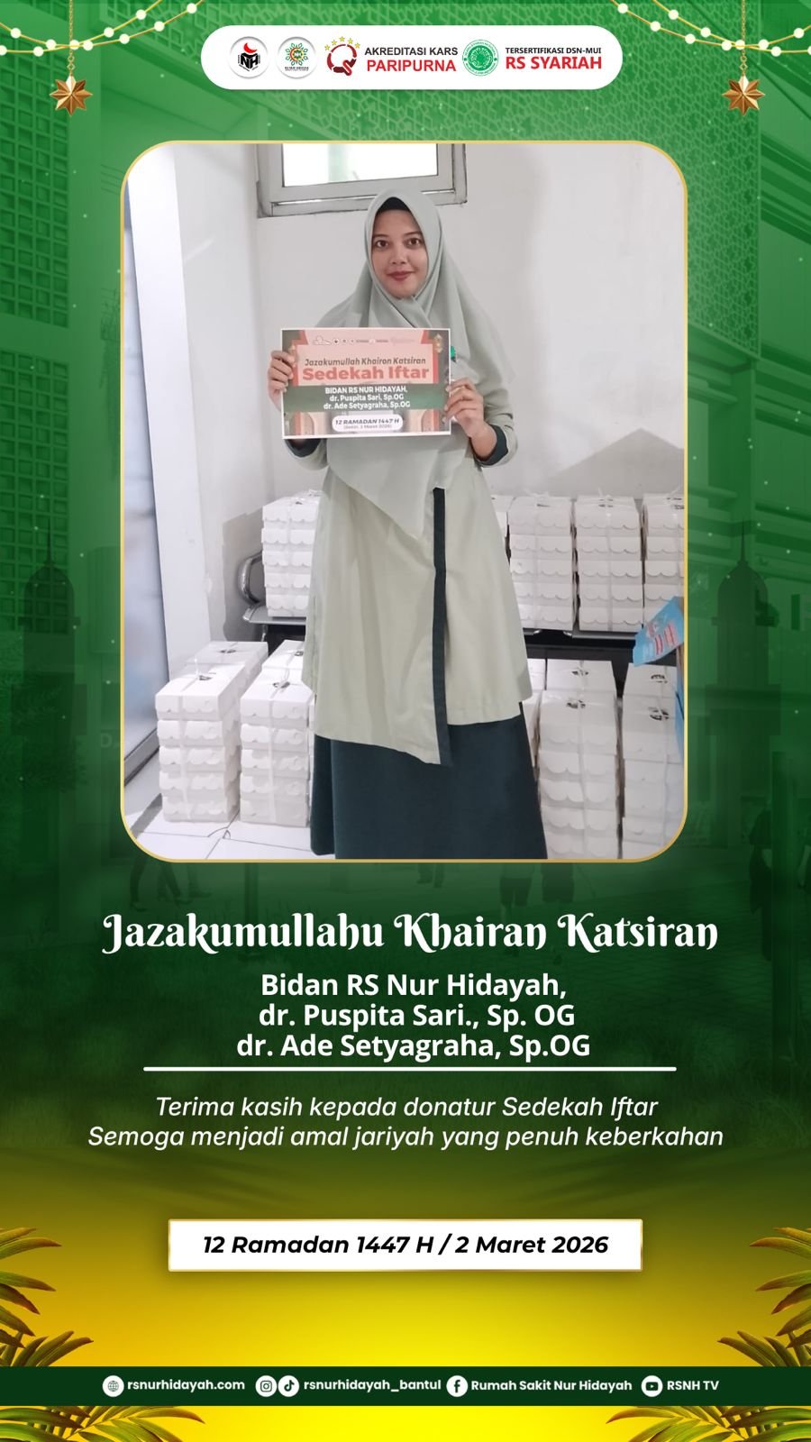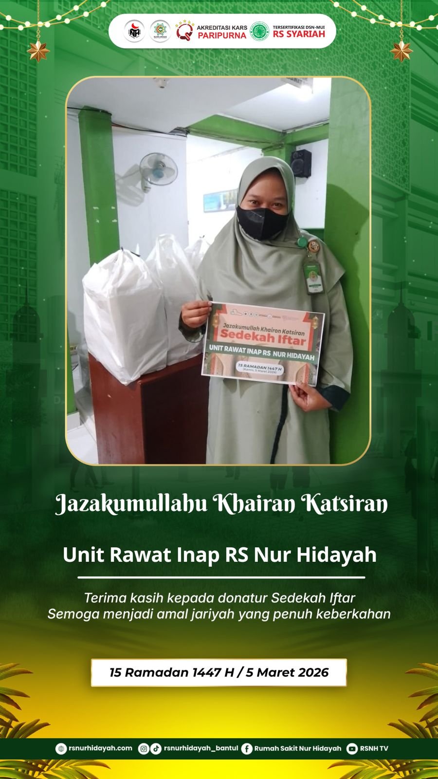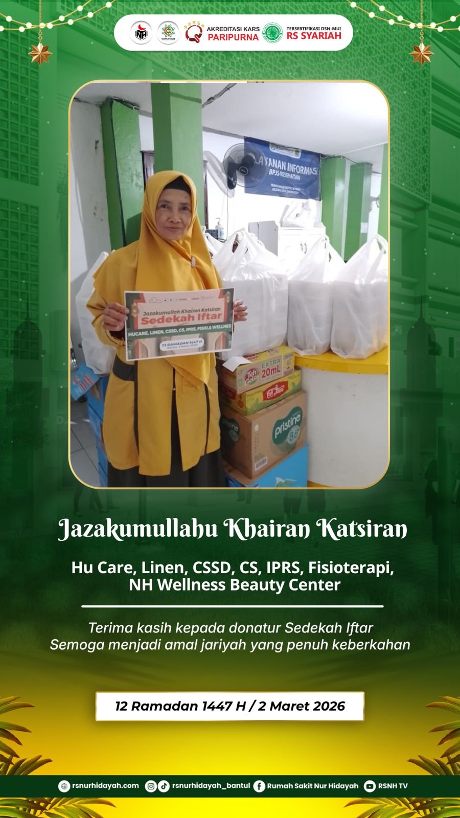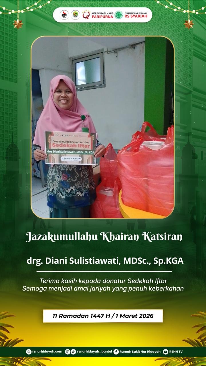 Informasi pada poster juga dilengkapi dengan jadwal imsakiyah tanggal 7 Maret 2026 / 17 Ramadan 1447 H, serta layanan UGD 24 jam Rumah Sakit Nur Hidayah yang siap melayani berbagai kondisi kegawatdaruratan kesehatan. Semoga pesan kebaikan ini dapat menjadi motivasi bagi kita semua untuk terus menebar manfaat bagi sesama.