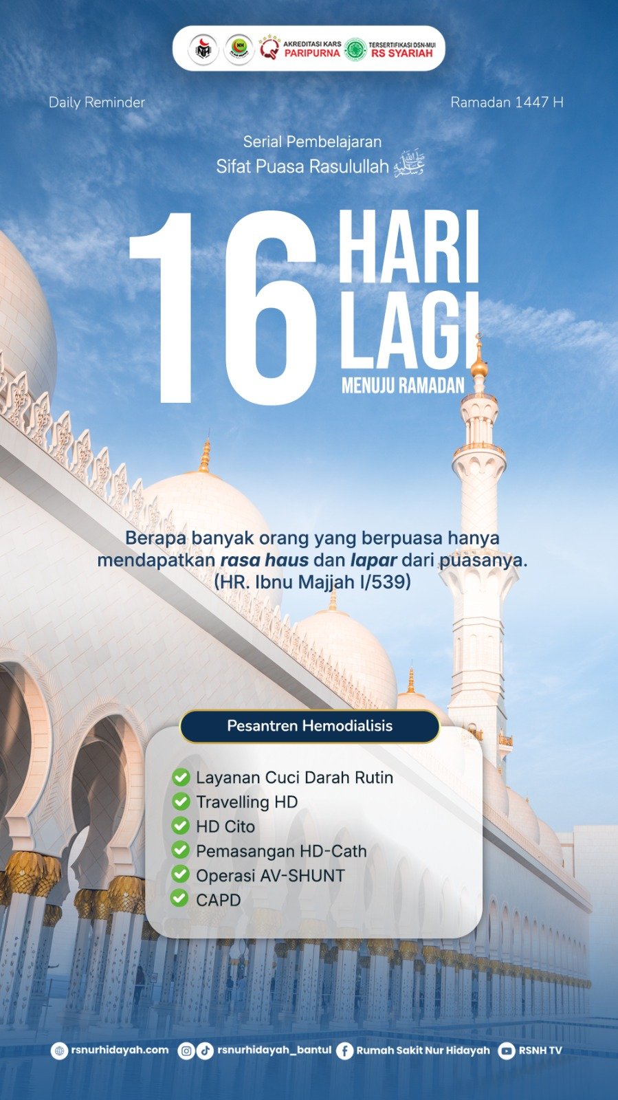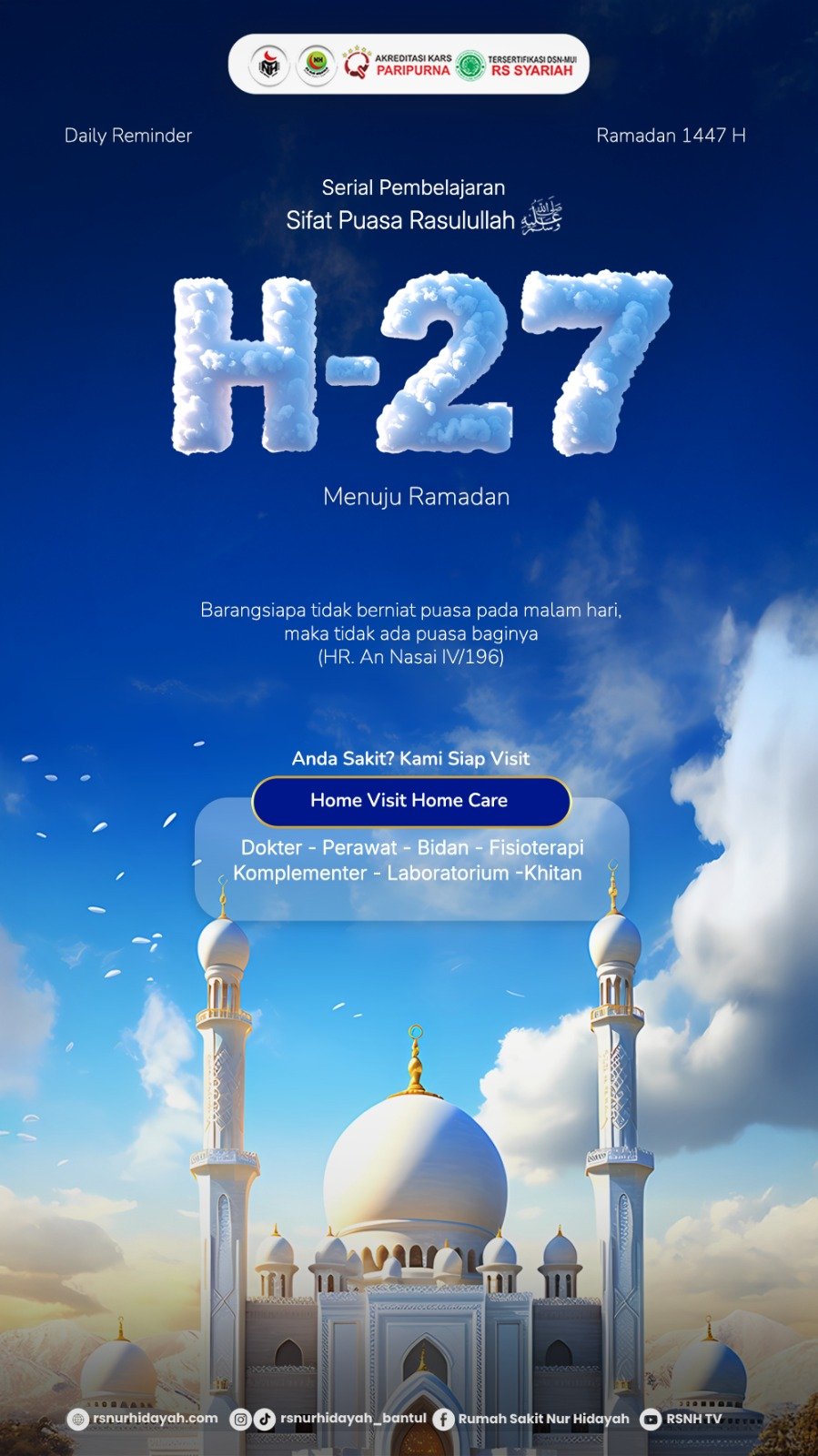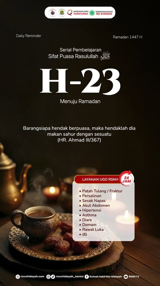 Ramadan merupakan bulan penuh keberkahan dan kesempatan untuk meningkatkan kualitas ibadah serta memperbaiki diri. Dalam rangka menyemarakkan bulan suci Ramadan 1447 Hijriah, Rumah Sakit Nur Hidayah menghadirkan Daily Reminder sebagai sarana pengingat dan pembelajaran mengenai sifat puasa Rasulullah shallallahu ‘alaihi wasallam.